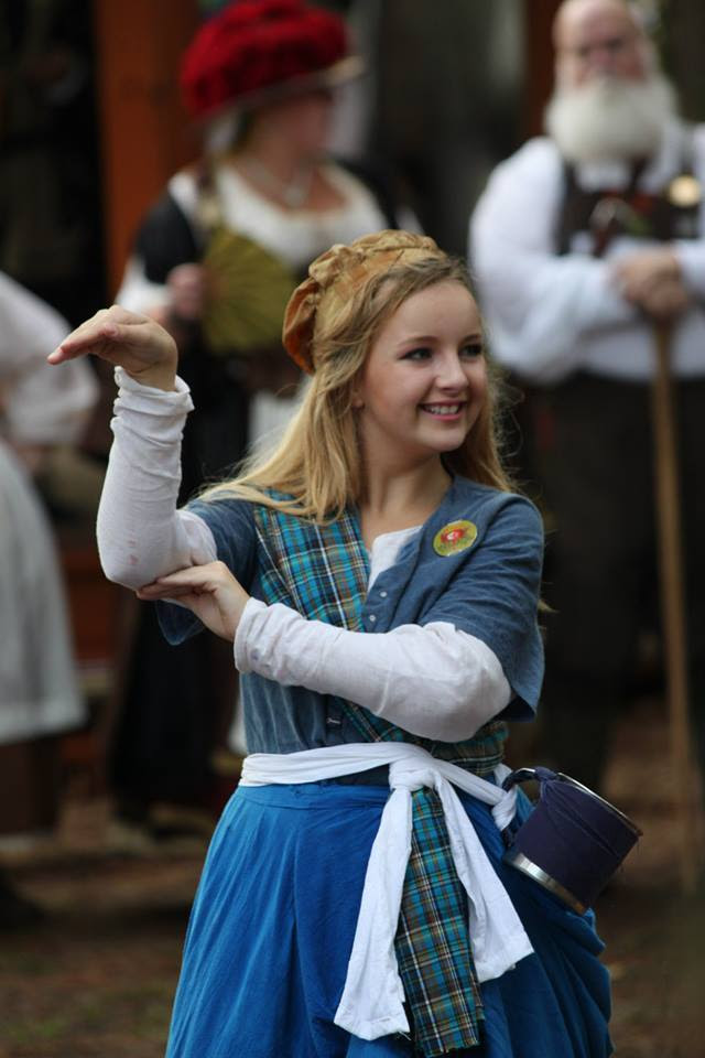 MSC: In my first year, I was a Scottish scullery maid. I was 14 and very new to performing, so the learning curve was definitely steep! I was then an English Joust Maiden my second and third seasons (2015 and 2016). I had the time of my life cheering on the jousters by yelling any variation of quasi-British chants I learned from former joust maidens and friends with a knack for writing parodies. In my 4th season, 2017, I had left the cast and then unexpectedly joined again. I was offered a position as a living statue. . .and later found out that I don’t do the whole “sitting perfectly still and not speaking” thing well. (When asked if I would do it again, I explained that *I* would consider it – but that I doubt any director would WANT me to do it).