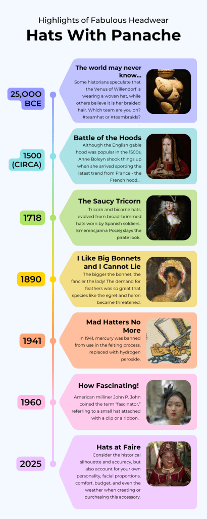 A Timeline of Toppers: From crowns to cloches, French hoods to fascinators, or hennin to baseball caps, headwear has been around since before humans began keeping written records; one of the earliest known confirmed hats dates back to the Bronze Age. Throughout history, hats have protected our heads from the elements, denoted our status in society, and been used as an art form.